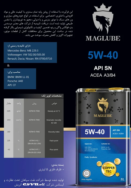 محصول "روغن موتور 5W40 مگلوب" در کشور ایران و در شرکت سپاهان ساخته شده است. این محصول API = SN دارد که به معنی جدید ترین سطح کیفی است که مصرف سوخت را کاهش میدهد و در برابر اکسیداسون مقاوم است.