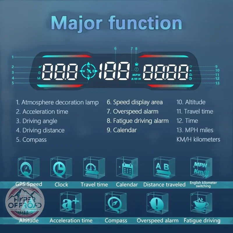 نمایش سرعت، مسافت، زمان رانندگی، ارتفاع، تایمر شتاب 0-100، ساعت، هشدار سرعت و خستگی